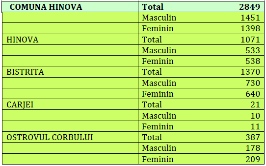 înregistrat o ușoară creștere, dar cu tendința de stagnare. Din 2005 și până în prezent, populația Comunei Hinova a rămas relativ constantă, variind de la 2803